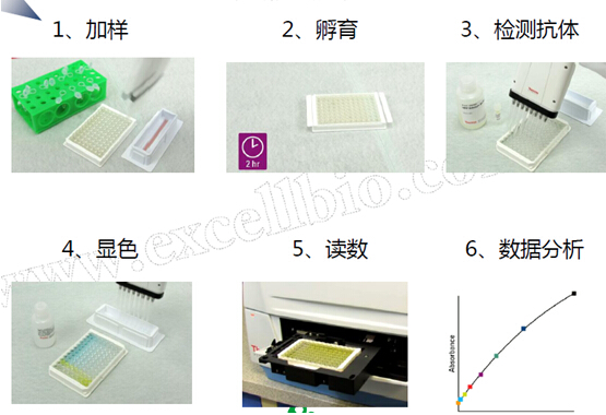 包被酶標(biāo)版>封閉 >加樣品孵育>洗滌 >加抗體孵育>洗滌 >加入酶底物>終止反應(yīng) >讀數(shù)
